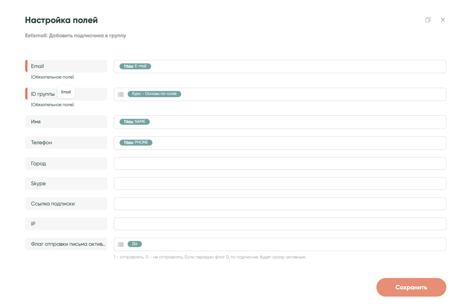 В открывшемся окне настроек сопоставь поля Tilda и Estismail.
