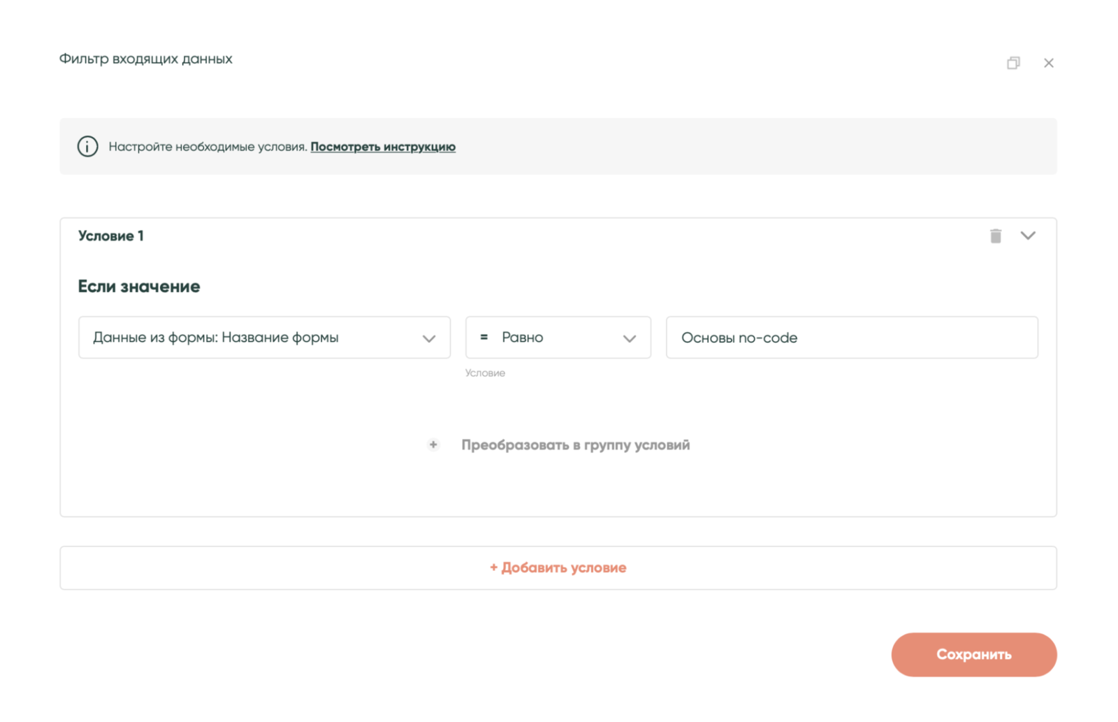 Условие запуска сценария — получение данных из любой формы на Tilda, но нужно запускать его только если данные из формы по курсу «Основы no-code». Чтобы настроить такое ограничение, воспользуйся инструментом «Фильтр данных».