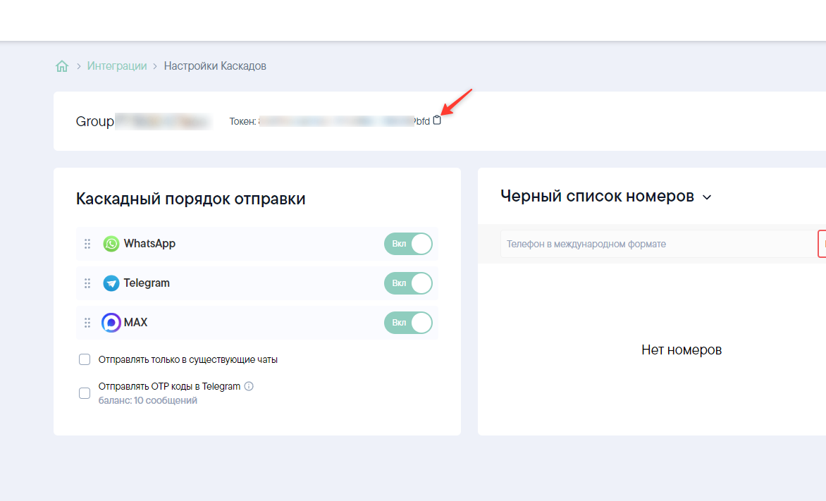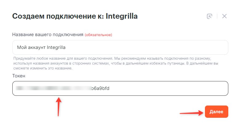 Вставьте скопированный токен доступа в поле Токен и нажмите Далее