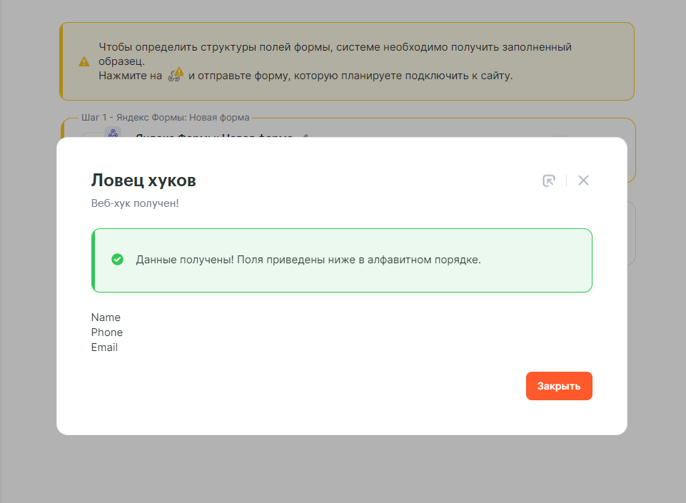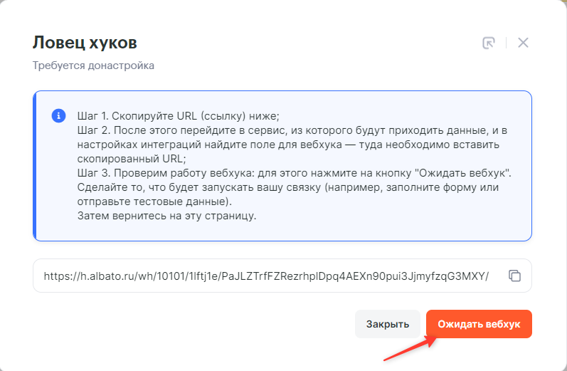 Нажмите Продолжить. В открывшемся окне нажмите на Ожидать вебхук и заполните нужную вам форму, чтобы триггер получил переменные формы для дальнейшей их передачи в последующие шаги связки