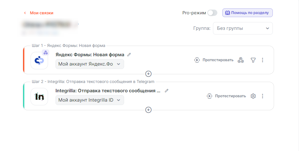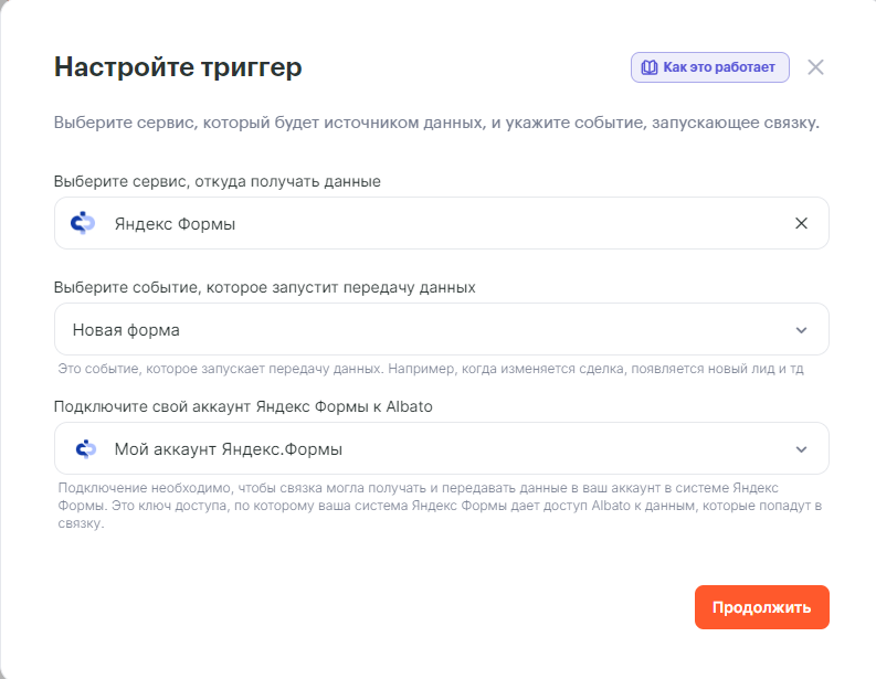 После создания подключения можно перейти к настройке связки. Рассмотрим пример с передачей сообщения в телеграм клиенту, заполнившему Яндекс.Форму. Подробнее о подключении Яндекс.Форм к Альбато