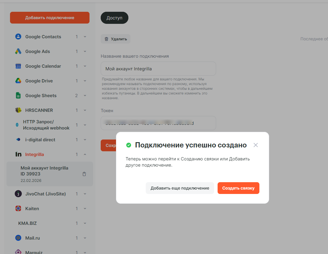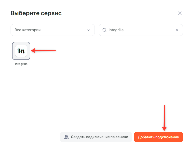 В списке сервисов найдите Integrilla и нажмите на Добавить подключение