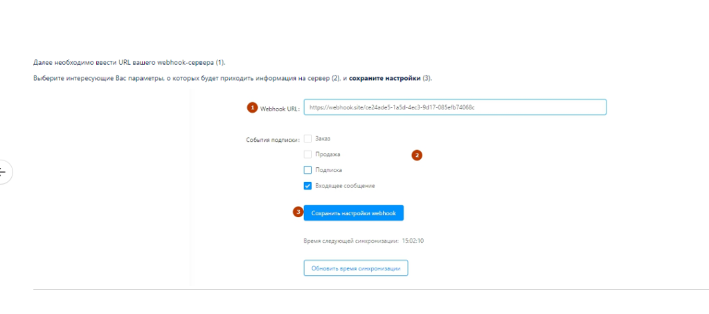 В поле «Webhook URL» вставьте вебхук, который вы скопировали при подключении. Поставьте галочки на все события подписки и нажмите на кнопку «Сохранить настройки Webhook».