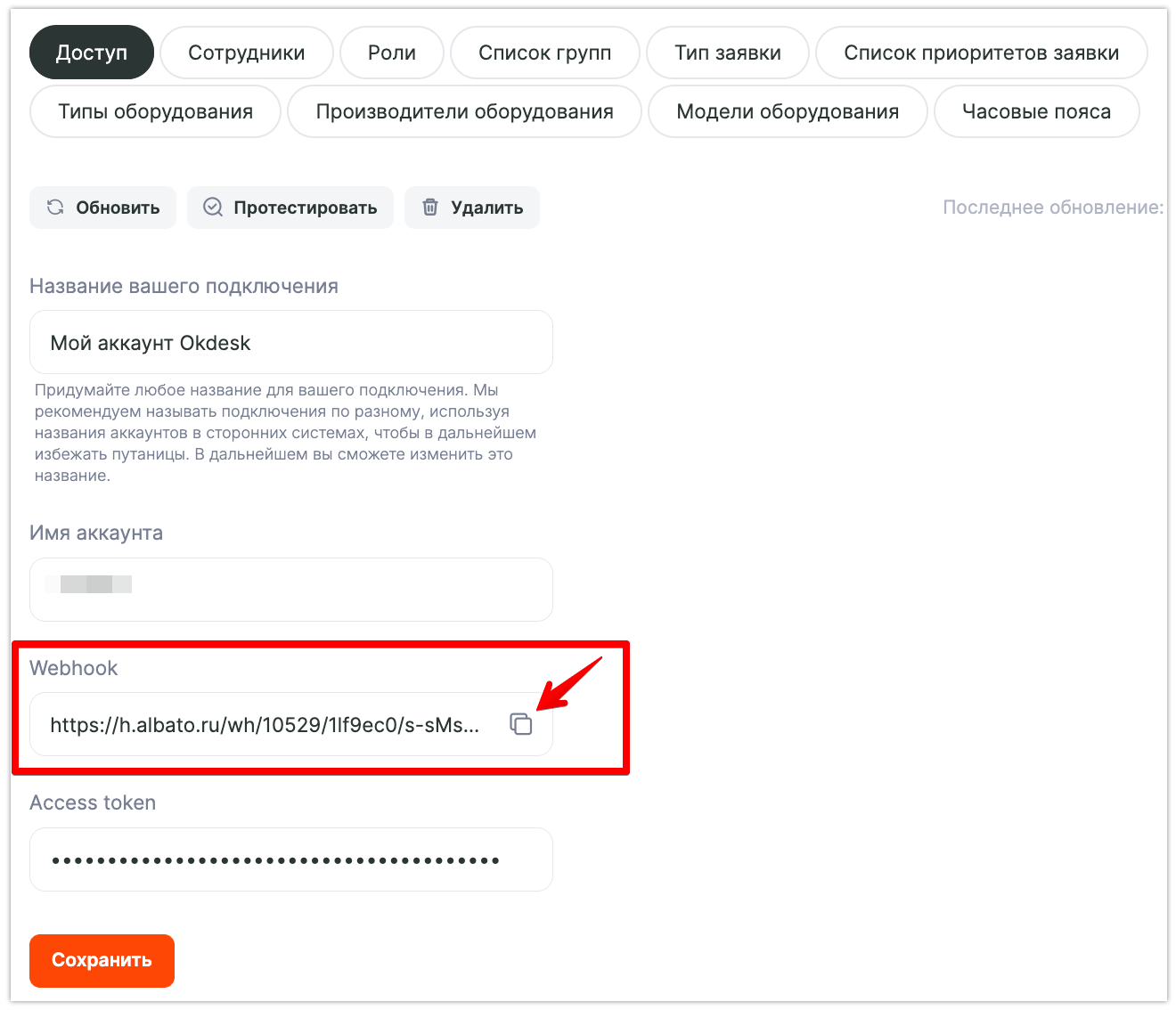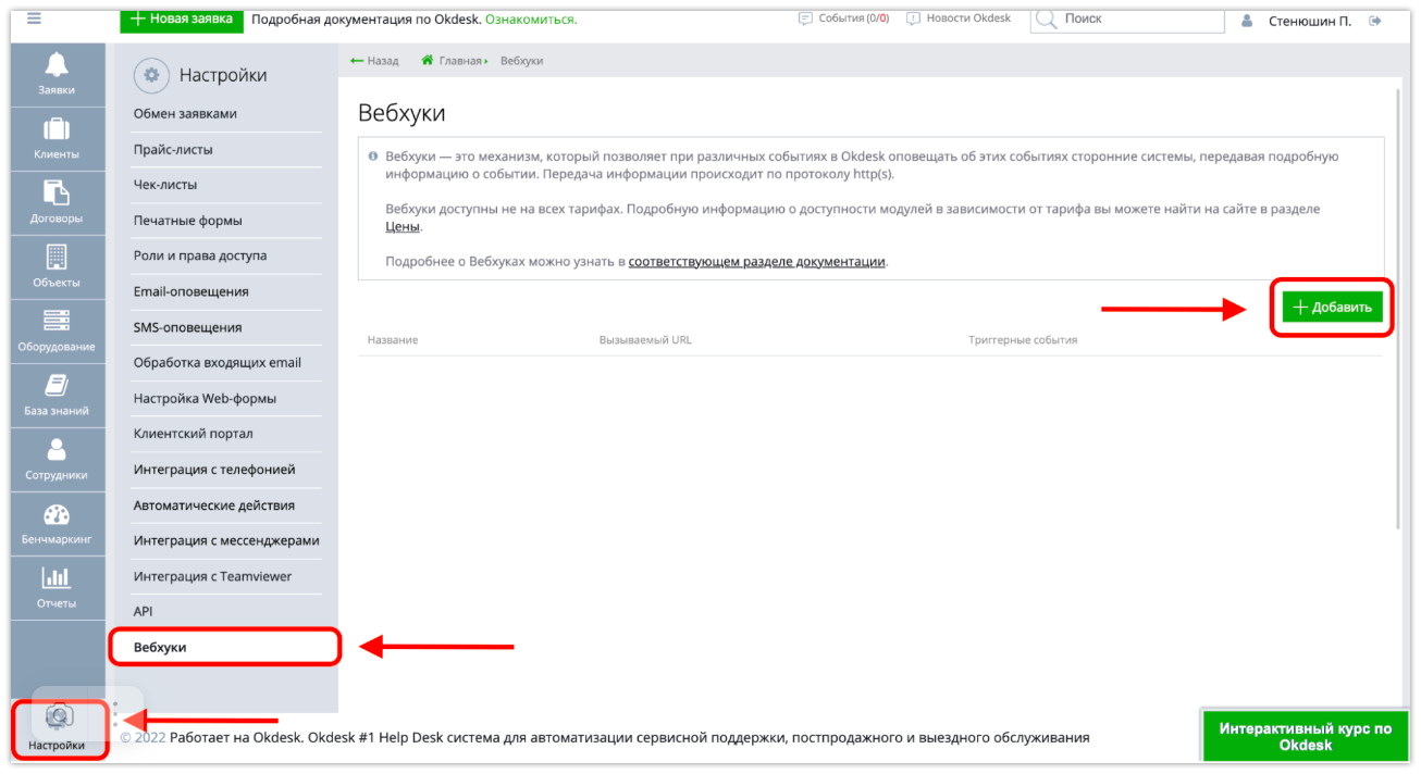 Нажмите «Ок», скопируйте вебхук и перейдите в настройки Okdesk, в раздел «Вебхуки».