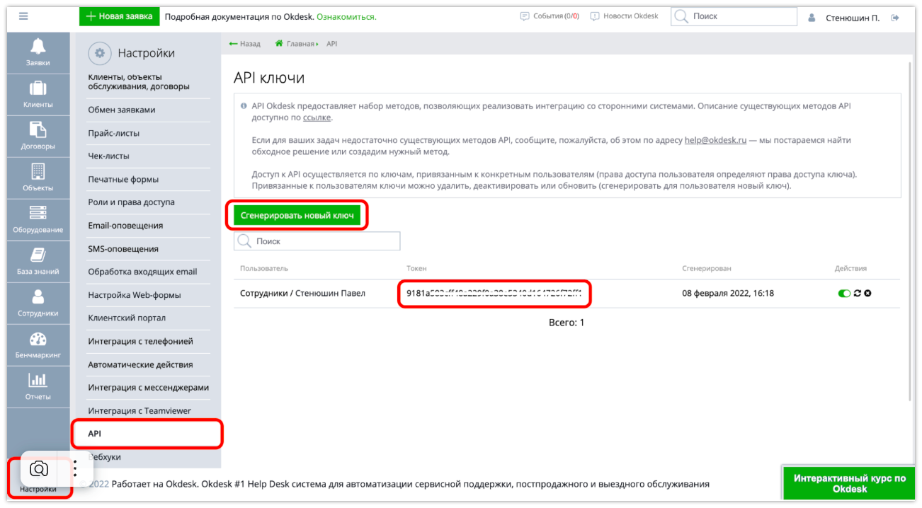 Чтобы получить API-ключ, перейдите в свой аккаунт Okdesk, выберите раздел «Настройки профиля» → «API», и скопируйте ключ из соответствующего поля: