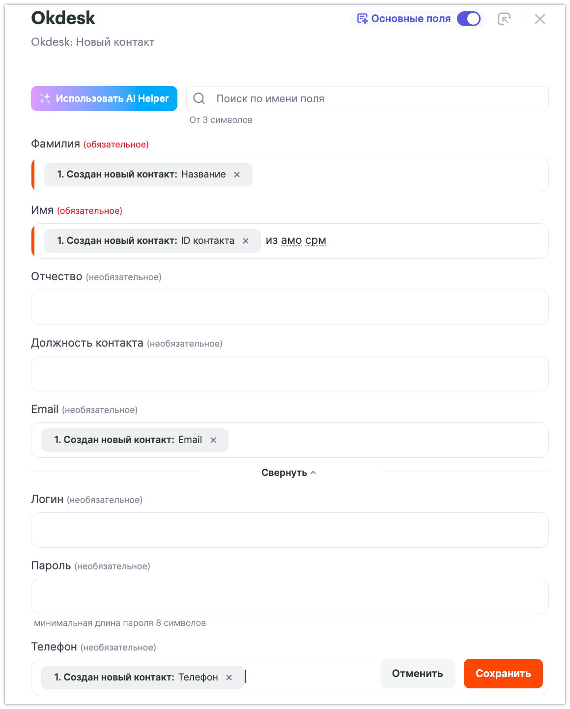 Связка готова, осталось её запустить. Теперь, при заведении нового контакта в amoCRM, данные автоматически попадут в Okdesk.