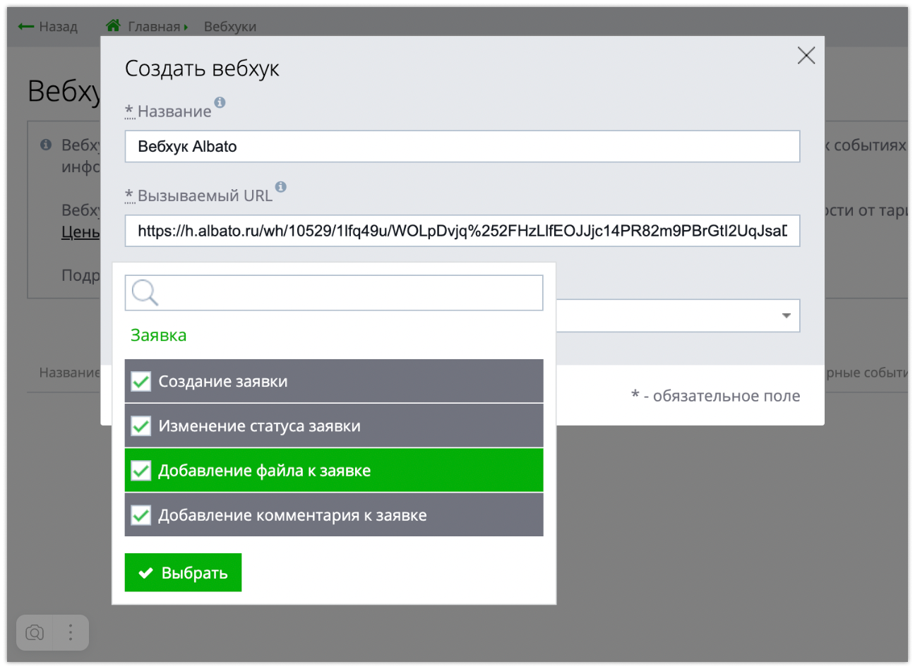 Для работы с большим количеством триггеров, нужно прописать вебхук, который сгенерировал Albato в настройках Okdesk и выбрать события, при достижении которых он будет срабатывать.