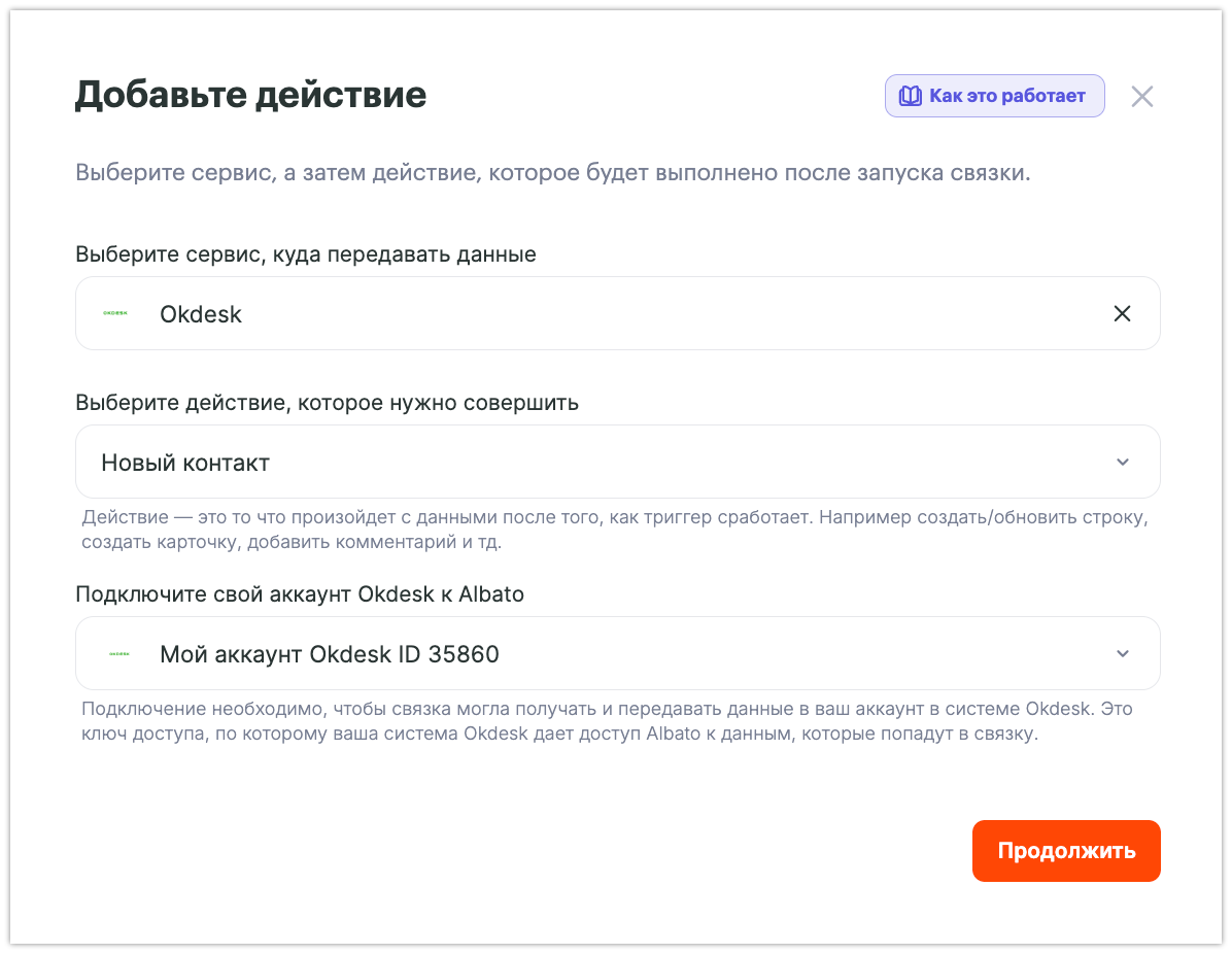 - Куда вы будете отправлять данные — «Okdesk».