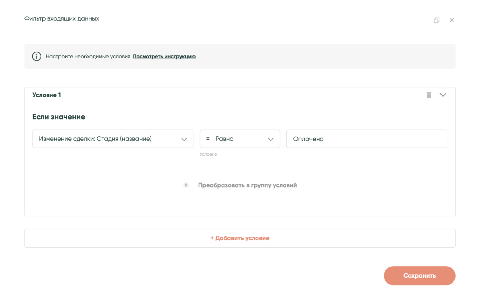 Условие запуска сценария — любое изменение сделки в «Битрикс24», но нам нужно запускать его только при изменении статуса на «Оплачено». Чтобы настроить такое ограничение воспользуйся инструментом «Фильтр данных».