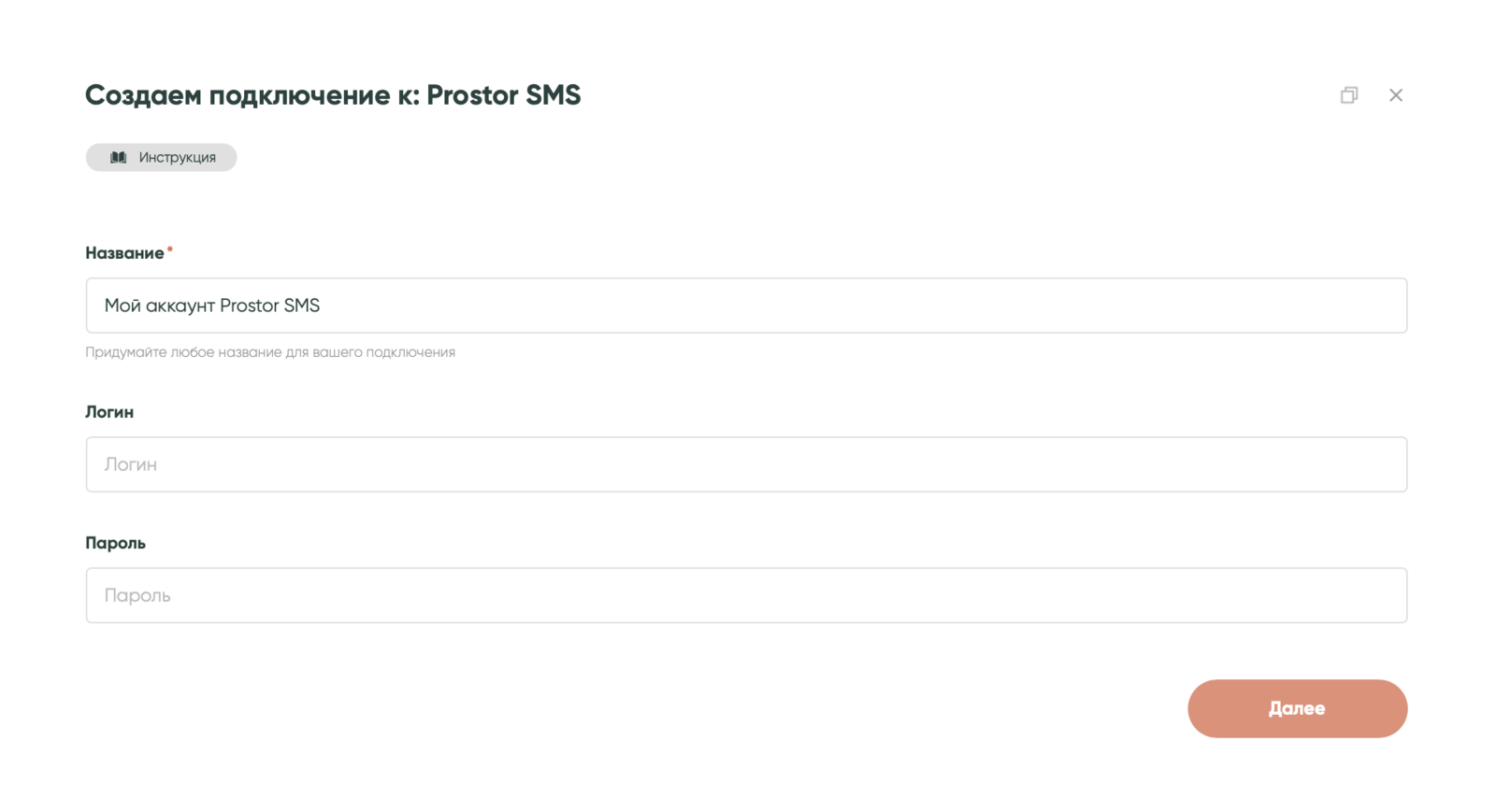 Нажми «Добавить подключение», задай ему название и введи данные для входа в свой аккаунт Prostor SMS.