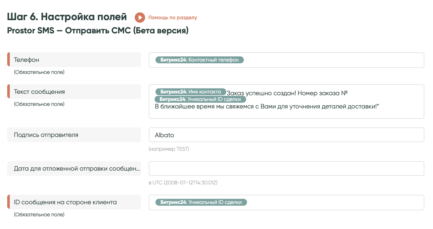 В поле «ID сообщения на стороне клиента» укажи «Битрикс24: Уникальный ID сделки».