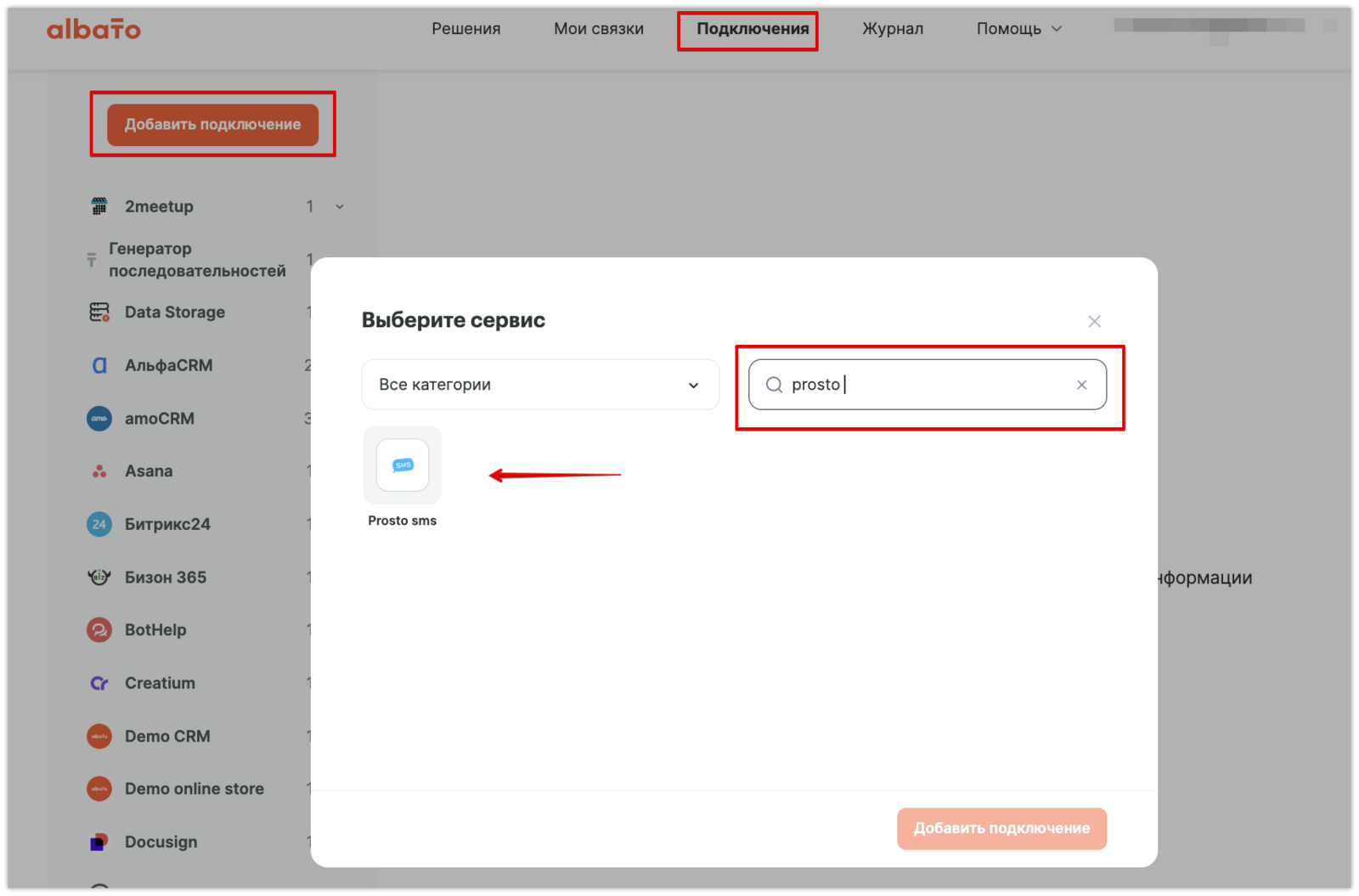 Зайди в раздел «Подключения», нажми на кнопку «Добавить подключение» и выбери из списка «ProstoSMS».