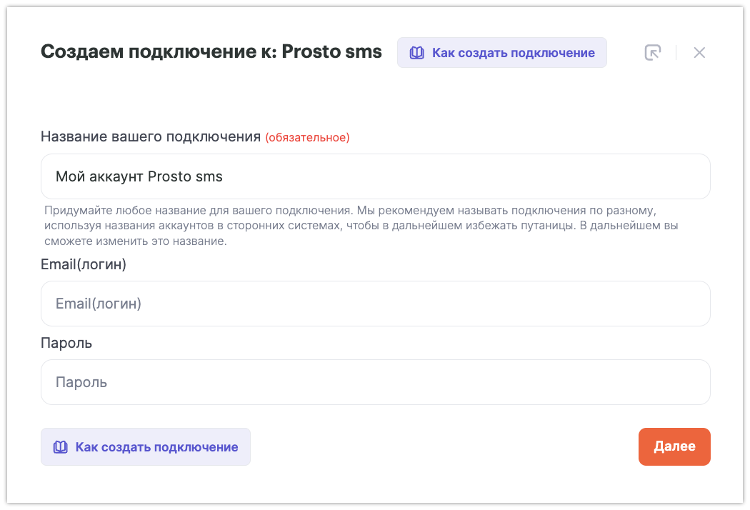 Нажмите «Добавить подключение», задайте ему название и введите данные для входа в ProstoSMS.
