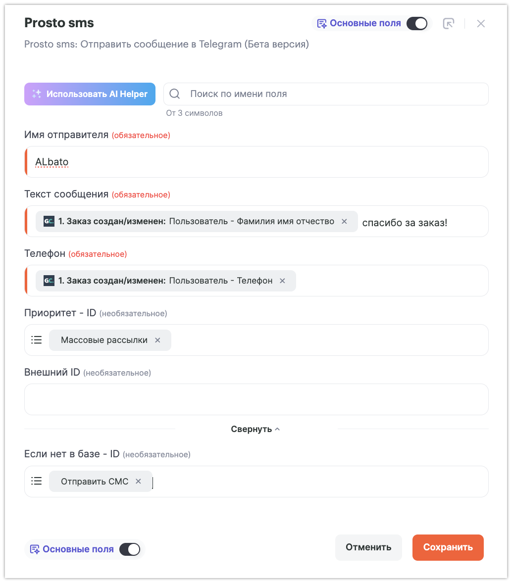Albato поможет автоматизировать коммуникации, создать сценарий рассылок через SMS, Telegram, WhatsApp и отправлять сообщения при помощи ProstoSMS