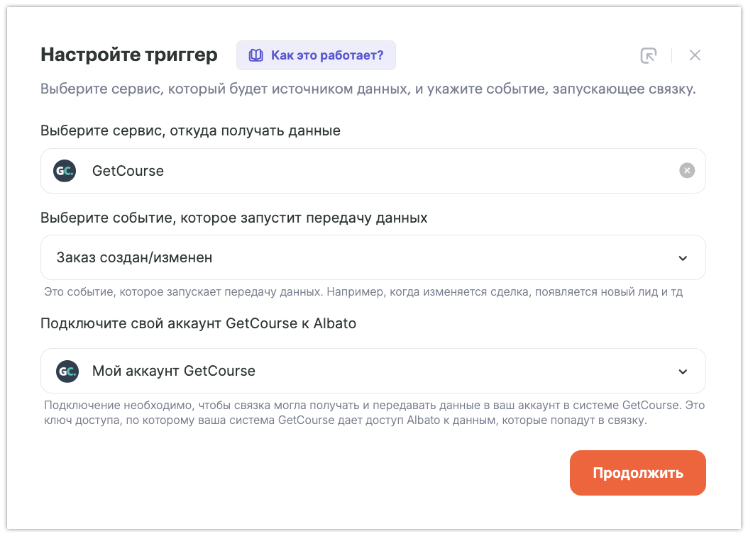 Выберите сервис, который будет запускать связку — «GetCourse».