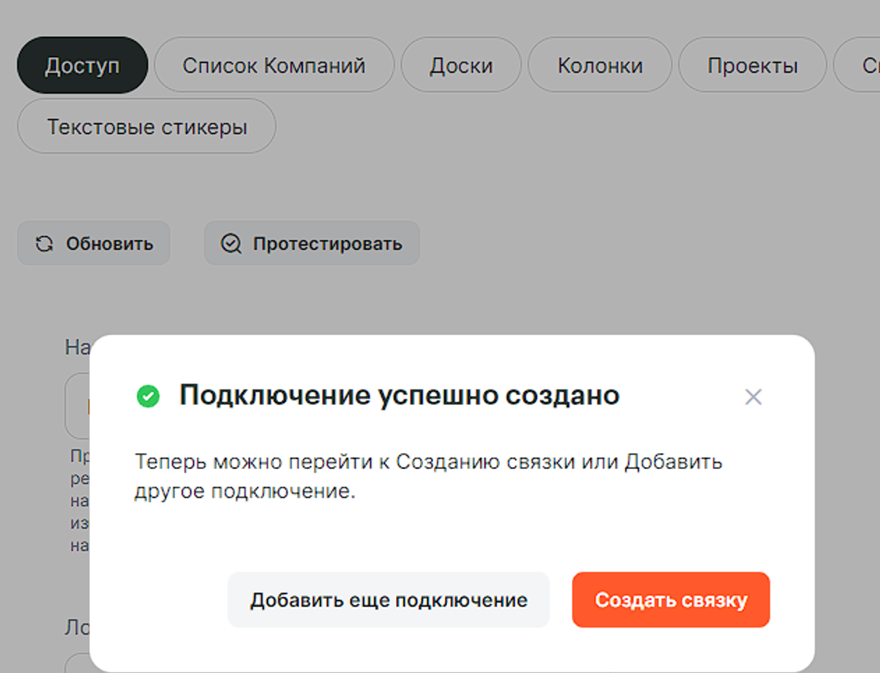 Чтобы у Вас отобразились созданные колонки из YouGile в кабинете ALbato в списках подключения, нужно выбрать соответствующие для этих колонок Проекты/Доски в кредвизе (глазик) в настройках связки.