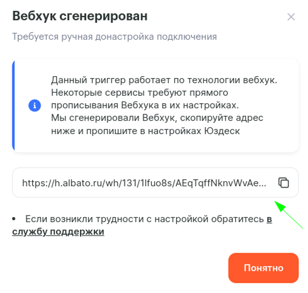 В следующем шаге, откроется окно с Webhook, скопируйте его и вернитесь в Юздеск: раздел «Каналы» → созданный API-канал Test.