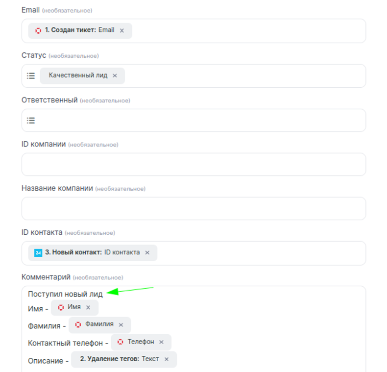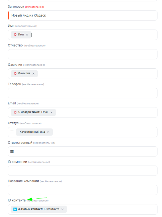 В открывшемся окне заполняем обязательные поля и привязываем новый лид к ранее созданному новому контакту.