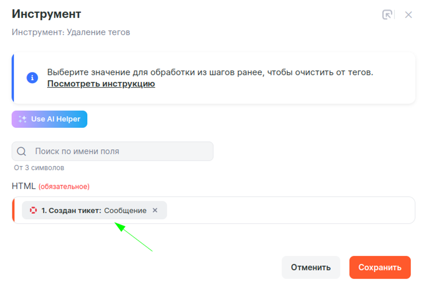 Шаг 2 — Переходим в раздел Инструменты, и в нем выбираем Инструмент: Удаление тегов, он необходим для того, чтобы очистить поле с сообщением от HTML тегов.