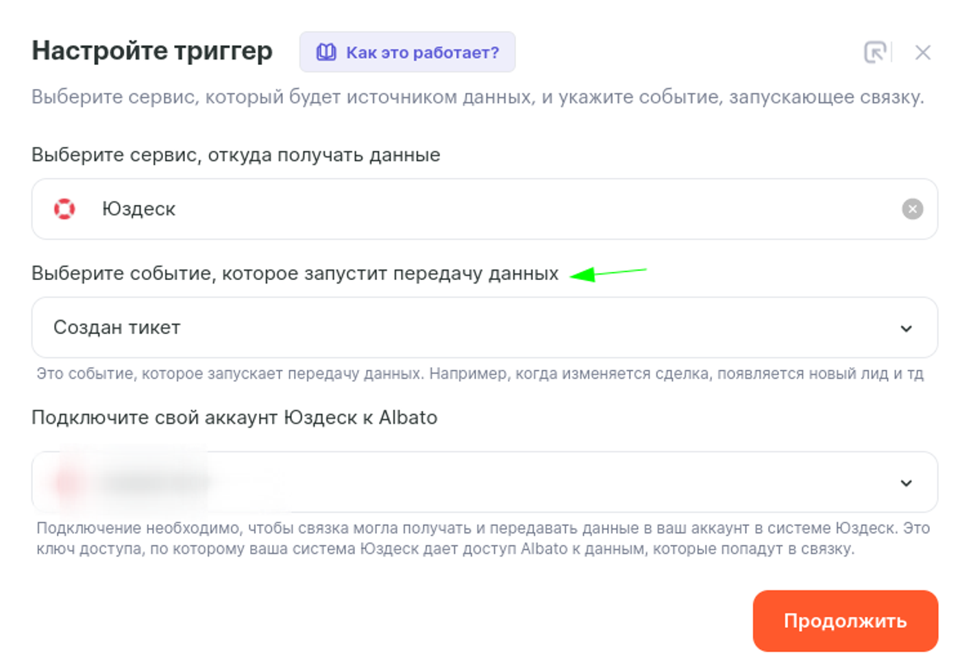 Шаг 1 — Выберите сервис Юздес’ триггер — Создан тикет и подключение.