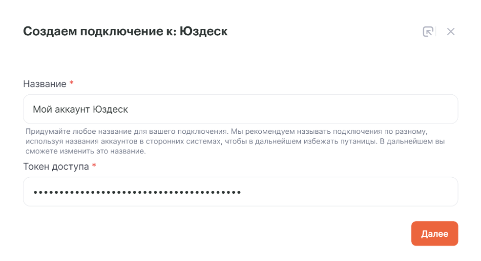 Придумайте удобное название для интеграции с Юздеском или оставьте название по умолчанию, а в поле «Токен доступа» вставьте секретный ключ, который скопировали на предыдущем шаге. Нажмите «Далее».