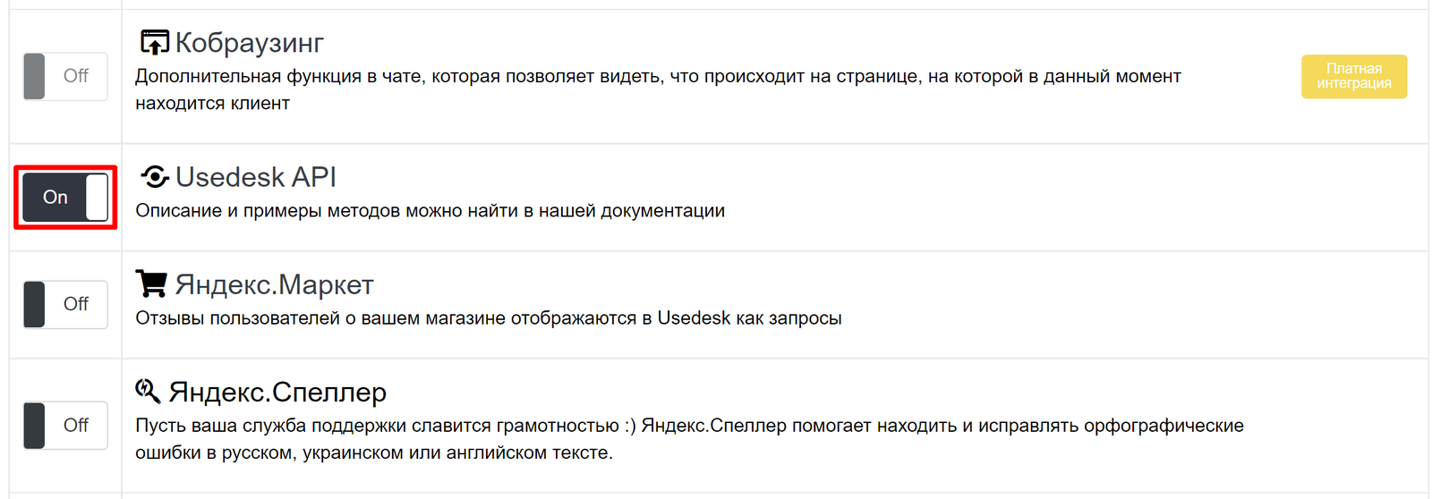 Зайдите в раздел «Расширения» в Юздеске и проверьте, что расширение «Usedesk API» включено.