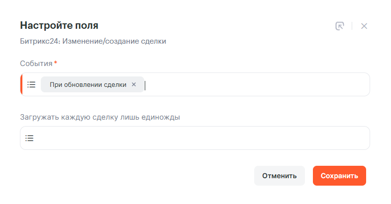 Создадим вторую связку. В качестве триггера выберем тот же что и в первой, но в настройках выберем другое событие, а именно При обновлении сделки.