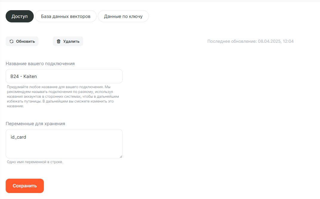 Добавим в подключении этот сервис и заполним его следующим образом. В качестве переменной создадим id_card и будем в неё записывать ID карточки Kaiten.