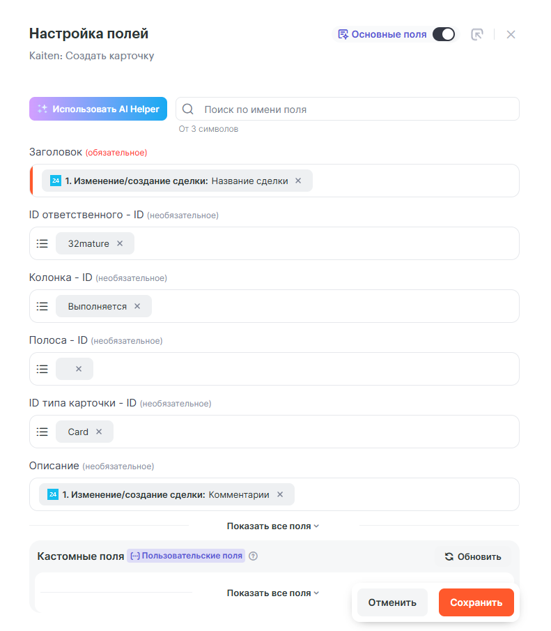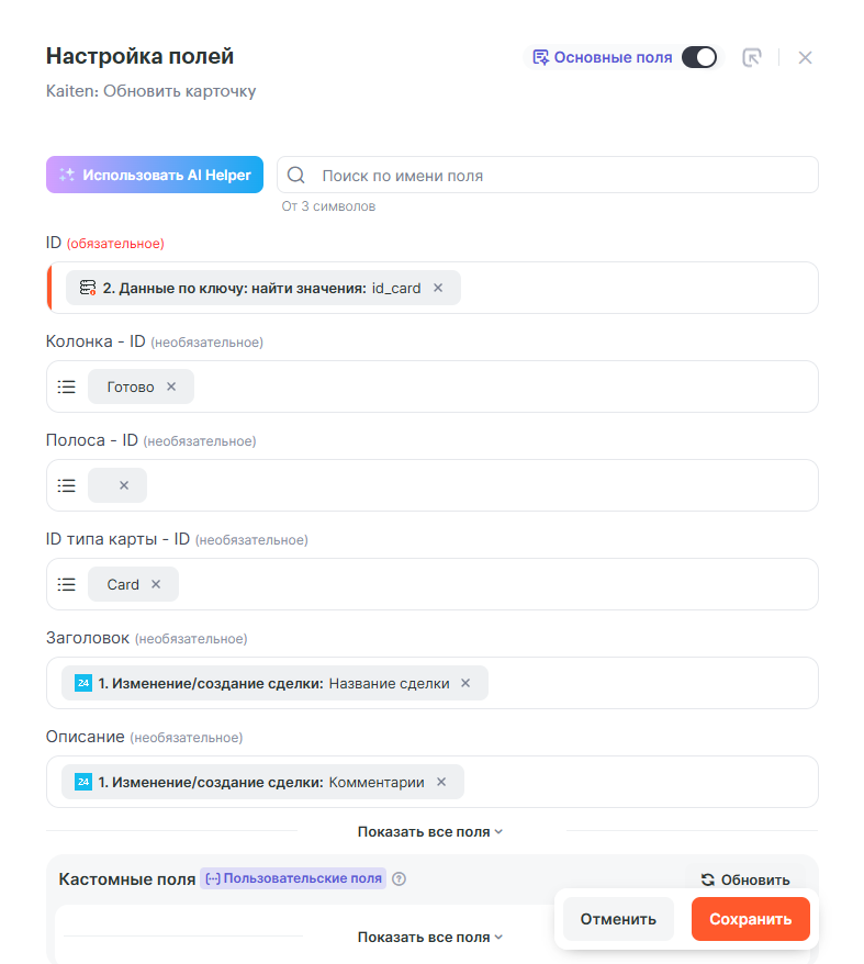 Как получать данные по сделкам из Битрикс24 и создавать/обновлять карточку в Kaiten