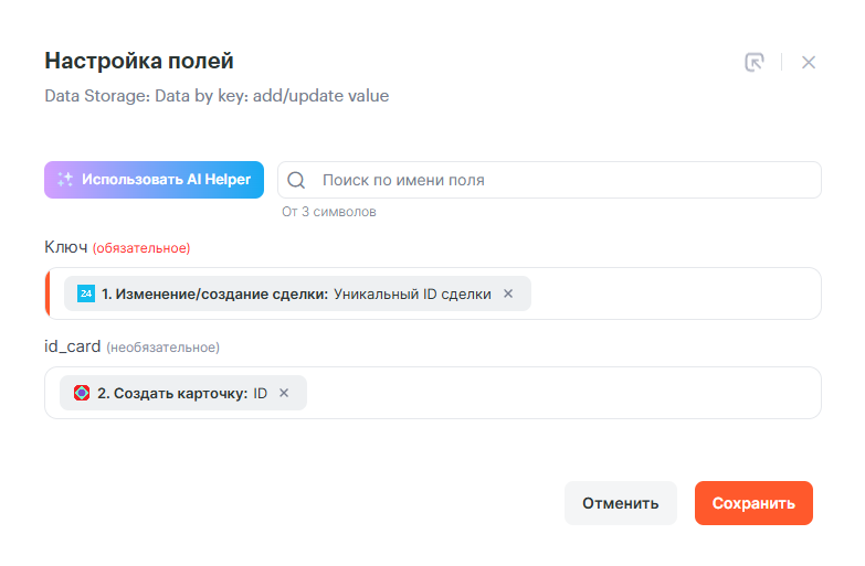 Так же необходимо предусмотреть запись ID карточки из Kaiten что бы во второй связке можно было её найти. Для этого можно использовать наш сервис Data Storage или Google Sheets. В этом примере будет использоваться именно Data Storage. Более подробно об этом сервисе можно посмотреть по этой ссылке — https://blog.albato.ru/instrument-albato-storage/