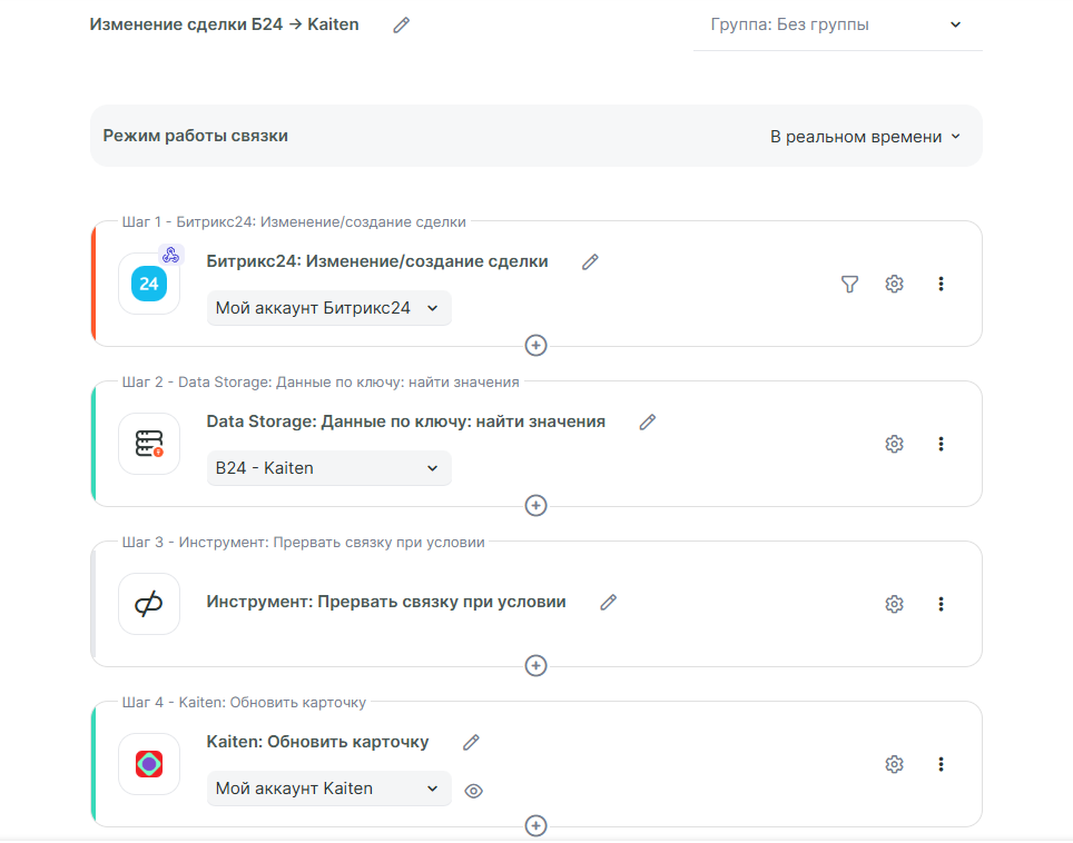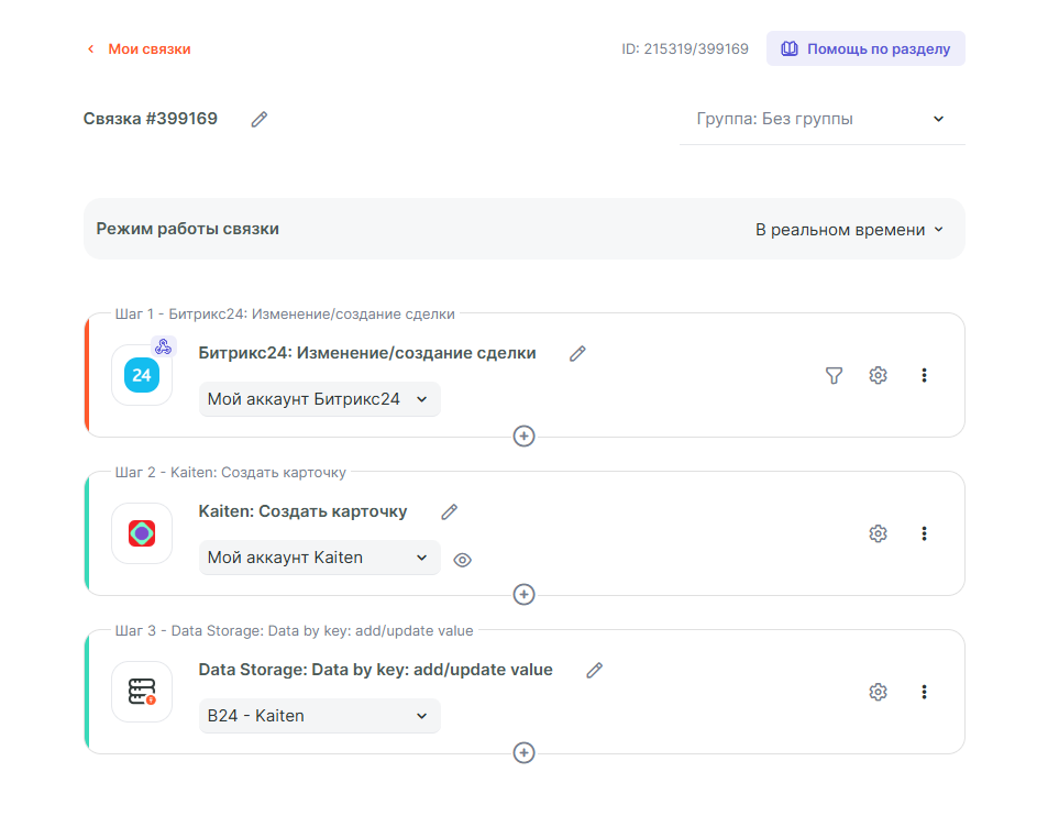 В данном примере будет рассмотрена интеграция, которая получает данные по сделкам из Б24 и создаёт/обновляет карточку в Kaiten. Для реализации потребуется создать две связки. Первая связка получает данные при создании сделки в Б24 и создаёт карточку в Kaiten, а вторая отслеживает изменения в сделках и обновляет карточку в Kaiten.