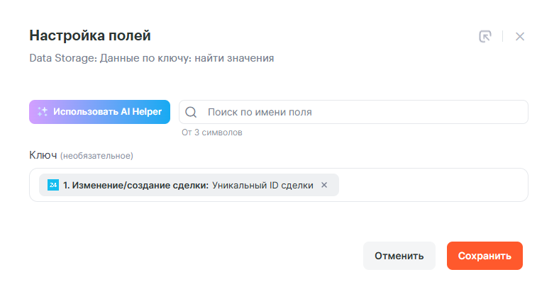 Вторым действием добавим действие Data Storage: Данные по ключу: найти значения и заполним его следующим образом
