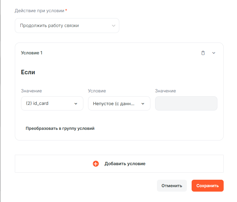Это действие вернёт ключ id_card в котором будет ID карточки Kaiten. Так же можно предусмотреть ситуацию, когда значения по этому ключу не будет. Можно проверить результат этого действия и продолжить выполнения связки или прервать. В этом примере используем инструмент Прервать связку по условию. Добавим его следующим действием и заполним.
