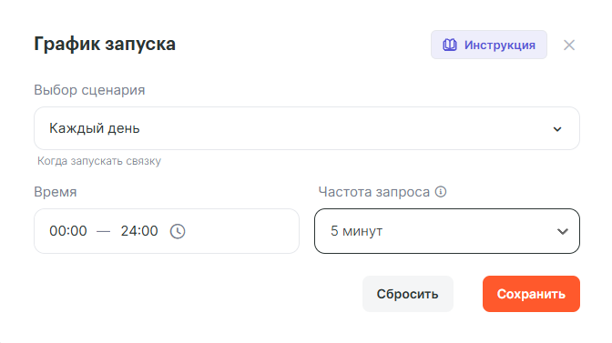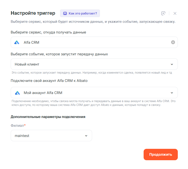 После чего нажимаем кнопку Продолжить и триггер настроен. Триггер работает по API, т.е Albato по умолчанию будет отправлять запрос в сервис AlfaCRM на получение новых данных и если данные будут в момент запроса, мы их получим и продолжим работу. Если данных не будет, то в журнале связки отобразится запись Нет новых данных. Частоту запроса к сервису по желанию можно настроить самостоятельно.