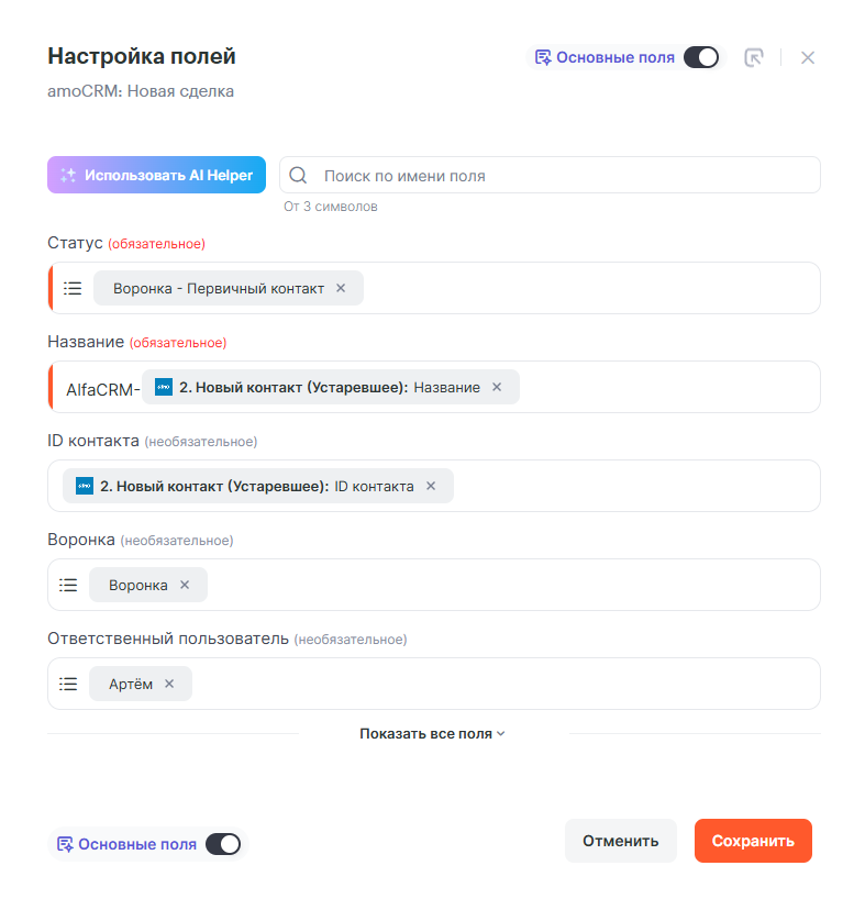 Так же заполните обязательные поля и остальные по желанию. Что бы связать контакт amoCRM со сделкой, необходимо будет заполнить поле ID контакта, передав переменную ID контакта от второго шага.