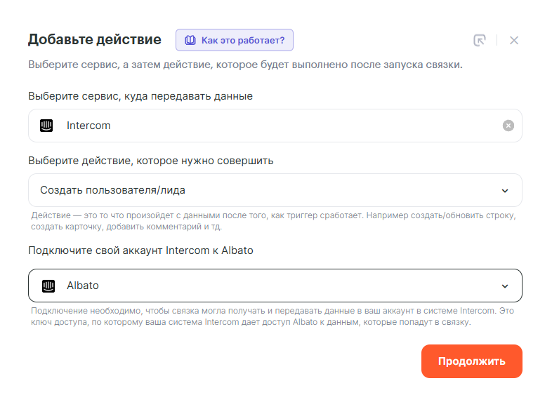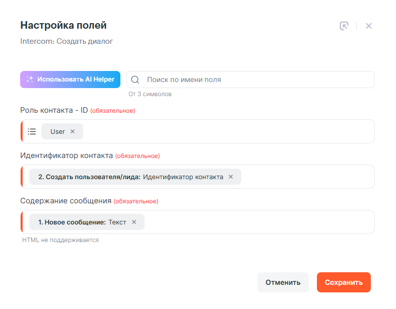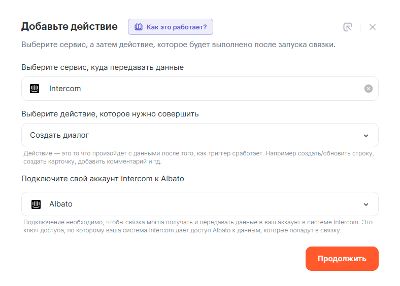 Последним шагом добавим действие Intercom: Создать диалог