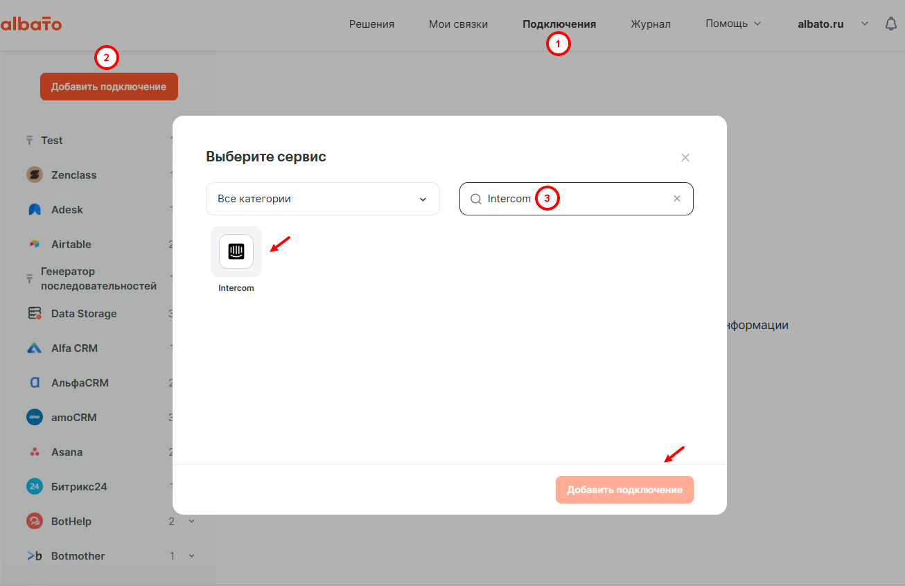 Для подключения сервиса Intercom перейдём в раздел Подключения → Добавить подключение и в поиске найдём сервис Intercom.