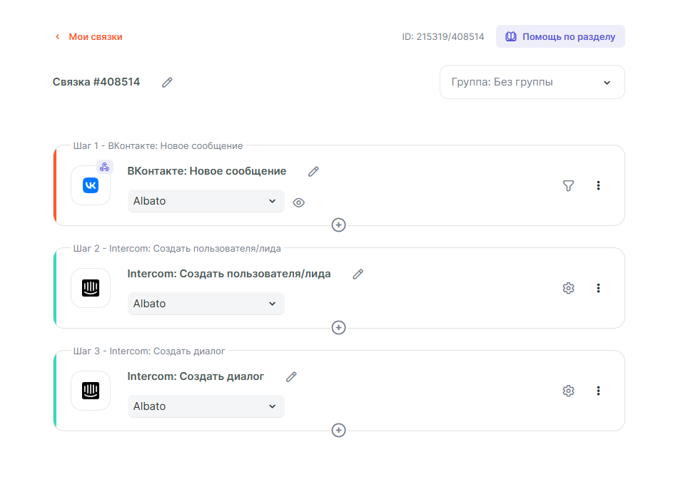 На этом процесс создания связки завершён. Если потребуется, то в связке можно предусмотреть создание диалога только один раз для одного и того же клиента из ВКонтакте. Для этого потребуется добавлять ID отправителя от ВКонтакте в инструмент DataStorage или Google Sheets. Вторым шагом сначала искать клиента и проверять результат поиска и потом либо создавать нового пользователя с диалогом в Intercom либо нет. Тут всё зависит от вашей задачи.