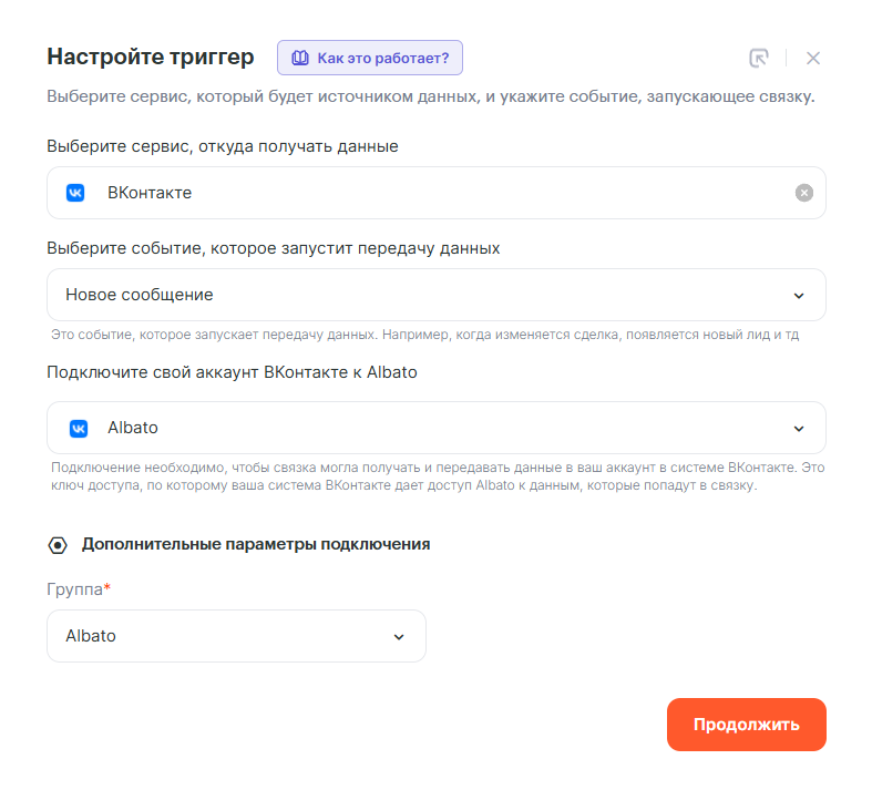 Для отслеживания события по новым сообщениям в нашей интеграции с сервисом ВКонтакте есть триггер — ВКонтакте: Новое сообщение. Выберем его в качестве первого шага. В настройках триггера необходимо будет выбрать группу из которой будем получать сообщения.