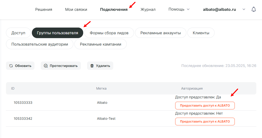 Так же требуется предоставить доступ к группе в разделе Подключения.