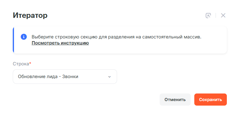 Так как записей со звонками может быть несколько, то необходимо пройтись по каждой записи, загрузить с помощью http запроса и только потом прикрепить в чат Telegram. Пятым шагом добавим инструмент Итератор и в качестве строковой секции выберем Звонки от первого шага.