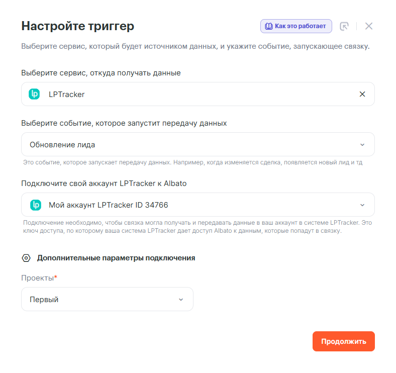 Для отслеживания события по обновлению лида в LPTracker в нашей интеграции с сервисом LPTracker есть триггер — LPTracker: Обновление лида. Выберем его в качестве первого шага и продолжим. Для работы триггера на стороне LPTracker должен быть создан проект, который так же необходимо будет выбрать.