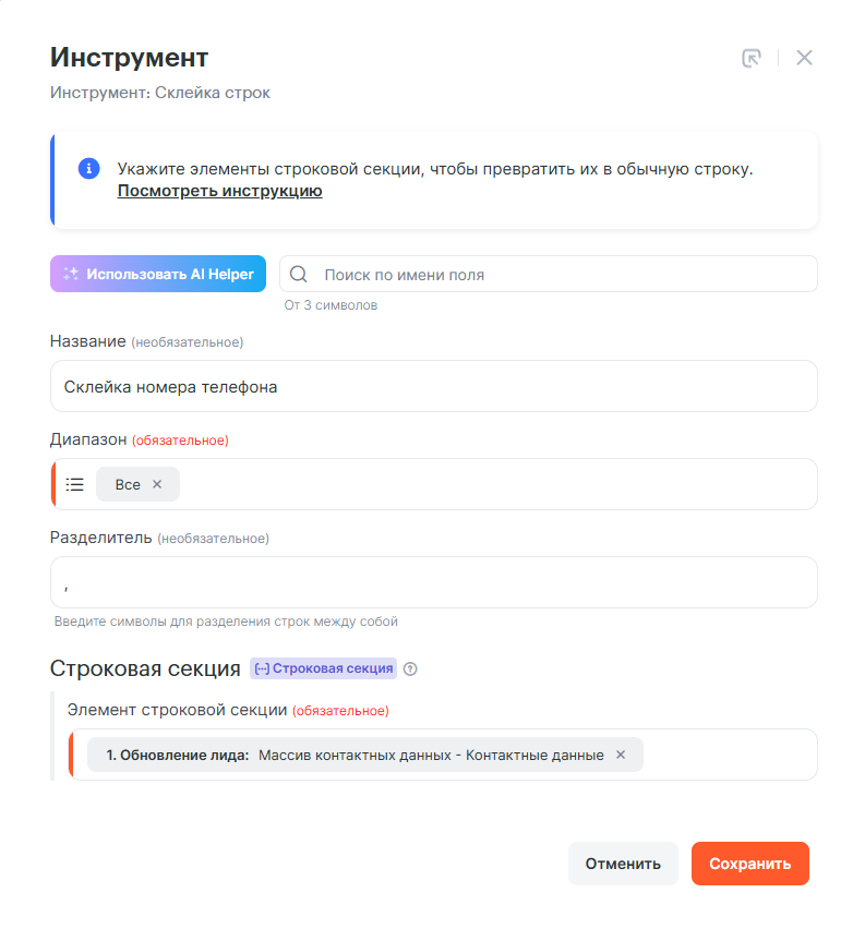 Добавим следующим шагом инструмент Cклейка строк и склеим номера телефонов, которые приходят в строковой секции Массив контактных данных. В качестве разделителя была выбрана запятая и пробел.