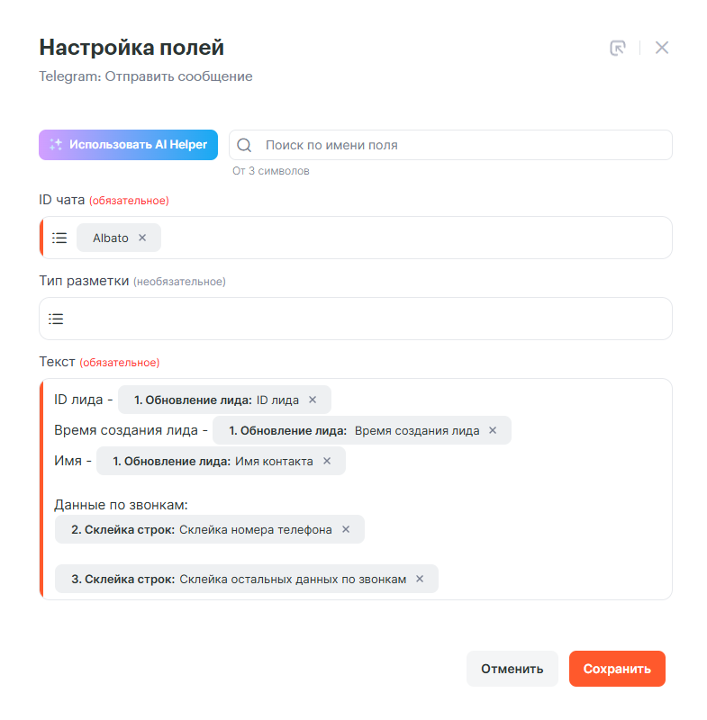 Данные по звонкам приходят в строковой секции Звонки и Массив контактных данных. Если необходимо в Telegram передавать номер телефона, длительность, время звонка и так далее, то необходимо будет использовать два инструмента Склейка строк, так как номер телефона приходит в строковой секции Массив контактных данных, а остальные в строковой секции Звонки.