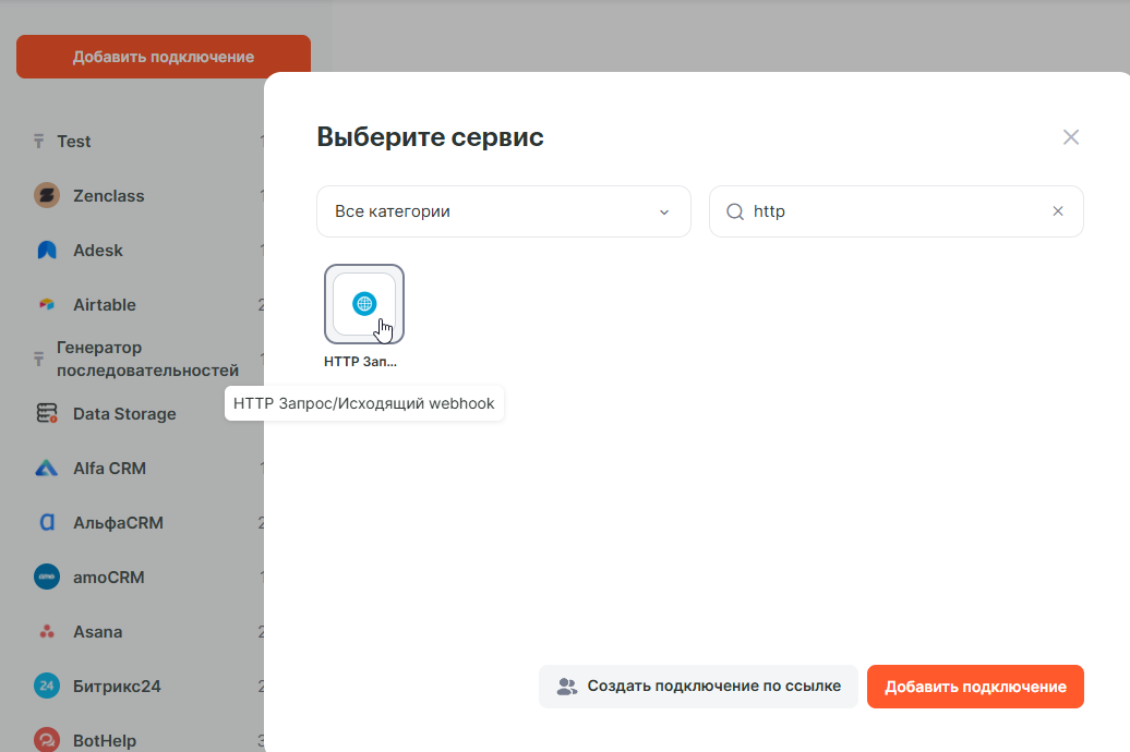 Далее создадим подключение с сервисом HTTP Запрос/Исходящий webhook.