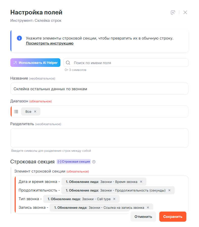 Добавим второй инструмент Склейка строк для остальных данных по звонкам. В качестве разделителя необходимо два раза нажать на кнопку Enter.