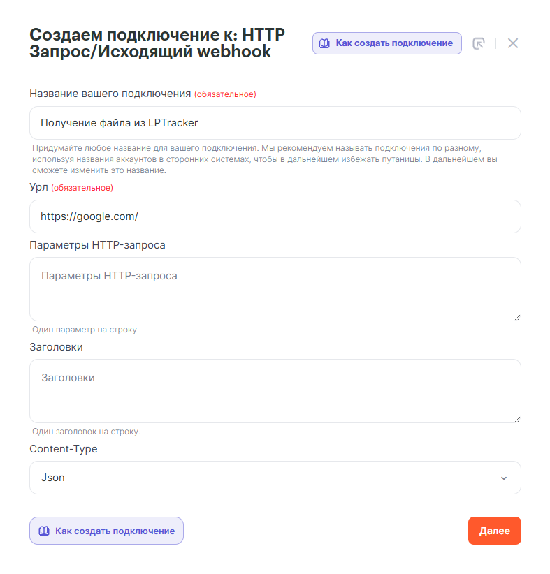 В настройках можете указать любой URL адрес, так как в самой связке будем его переопределять, а в поле Content-Type выберем значение JSON и сохраним.