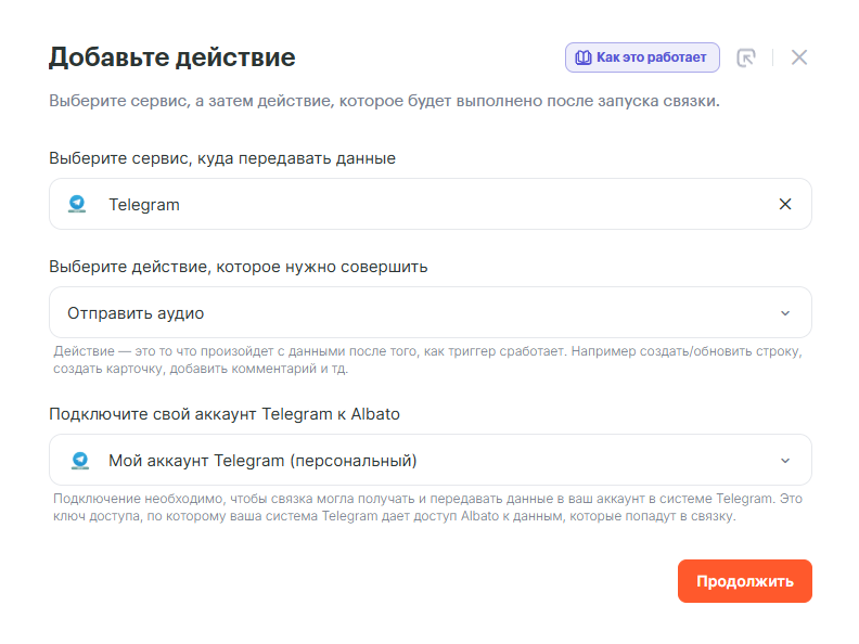 Последним шагом добавим действие Telegram: Отправить аудио