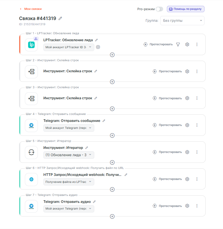 В данной инструкции будет рассмотрен пример простой интеграции, которая позволит получать информацию по звонкам при обновлении лида из LPTracker и далее передавать эти данные в Telegram в виде текста и файла.