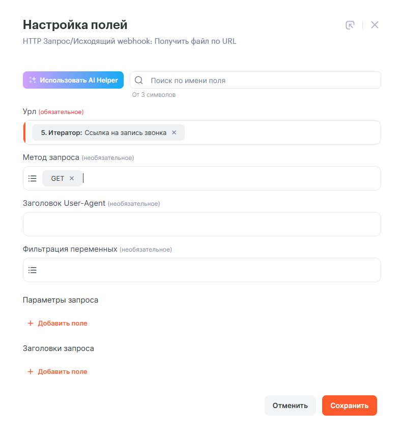 В поле URL выберем переменную Ссылка на запись звонка из инструмента Итератор, а в качестве метода запроса укажем GET и сохраним настройки.